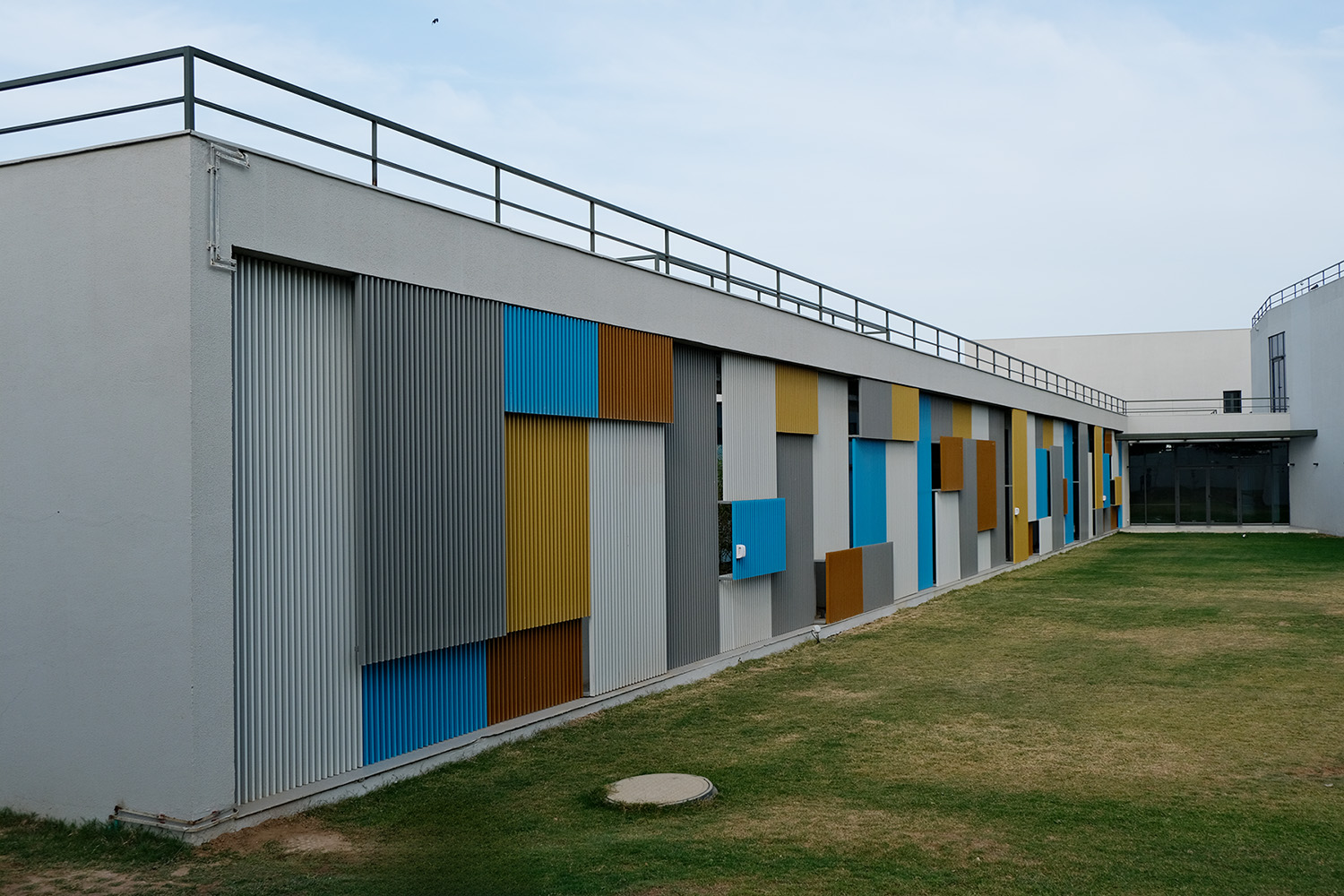 One of the standout features of Agrocel House is its striking jaali facade. Composed of vertical aluminum members, powder-coated in vibrant shades of blue, orange, and chrome yellow, the facade breaks the monotony of the all-white exterior. This design not only adds a splash of color but also creates an ever-changing interplay of light and shadow within the interiors, adding a layer of visual intrigue.